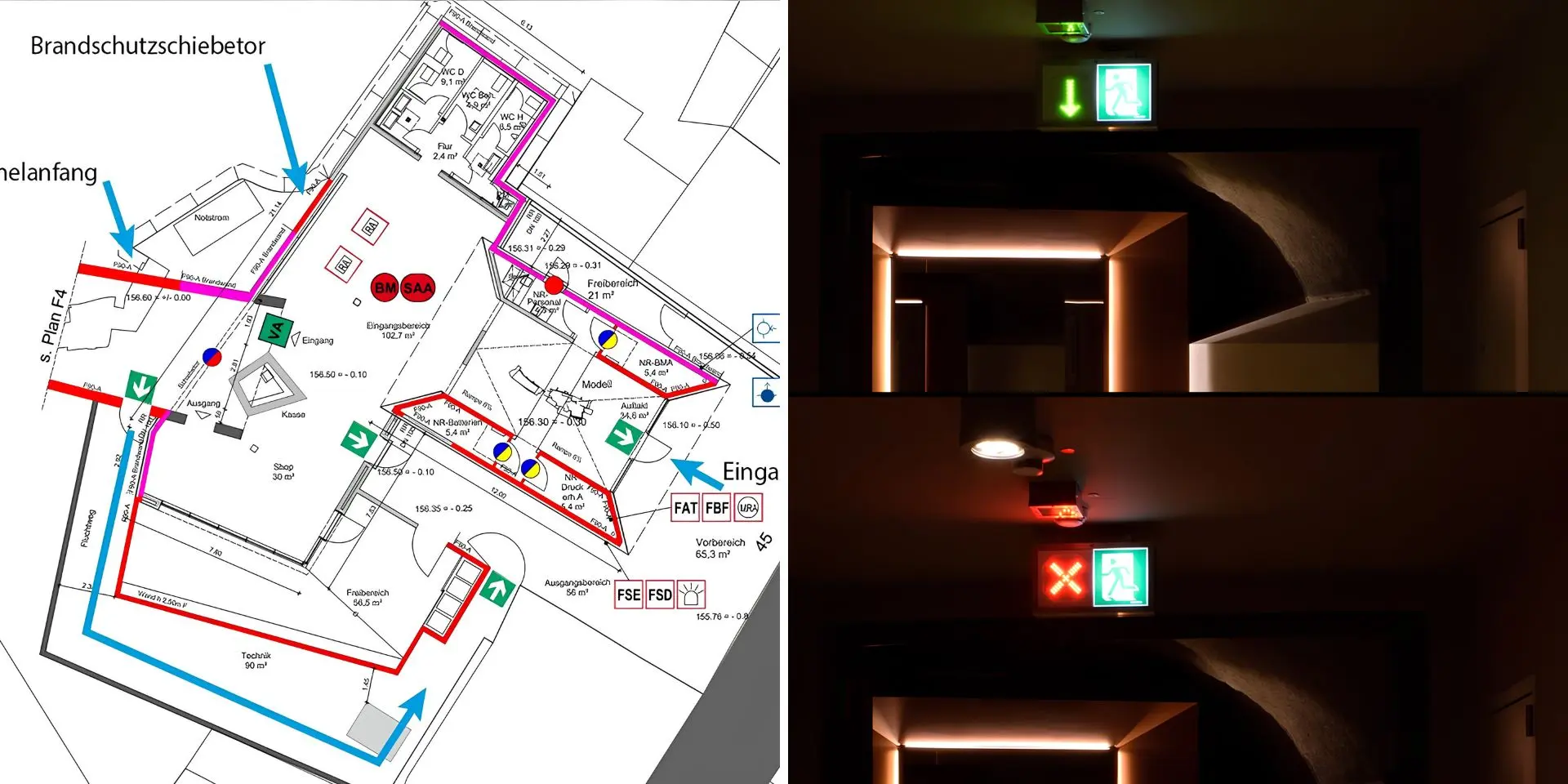 Una volta stabiliti questi parametri, il progettista definisce con precisione il posizionamento degli apparecchi. Le planimetrie dell’edificio diventano la base operativa su cui disegnare una distribuzione strategica, pensata per garantire continuità visiva, chiarezza e assenza di zone d’ombra. L’illuminazione deve essere presente nei punti di svolta, dove il percorso cambia direzione, e in prossimità delle uscite di sicurezza, che devono risultare immediatamente riconoscibili anche in condizioni di panico o scarsa visibilità. I segnali sicurezza indicanti le uscite ed i cambi di direzione devono essere ben visibili e adeguatamente illuminati (meglio se retroilluminati), così come tutte le attrezzature di emergenza, come estintori, idranti o pannelli antincendio, che richiedono una luce dedicata per essere facilmente individuabili. Anche gli ostacoli o i dislivelli lungo le vie di fuga devono essere illuminati per evitare cadute o situazioni di pericolo.
