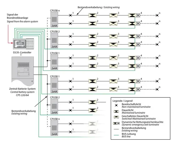Il sistema deve poi essere collegato sia all’alimentazione ordinaria sia a una fonte di alimentazione di sicurezza, come i pacchi batterie di un sistema centralizzato. Questa doppia alimentazione è il cuore del sistema di emergenza: consente l’attivazione automatica degli apparecchi nel momento in cui si interrompe l’energia principale, senza che sia necessario alcun intervento manuale.