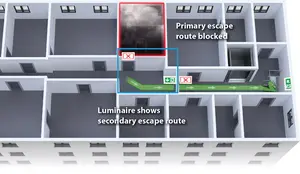 Se la scala di fuga o la via di fuga è bloccata dal fumo, si utilizza la seconda scala. Tutti gli apparecchi di segnalazione della via di fuga che hanno segnalato la via di fuga in direzione della scala interessata mostrano ora un simbolo di blocco rosso (croce) e bloccano quindi visivamente la via in direzione dell'incendio. In questo modo le persone che fuggono dall'edificio sono guidate nella giusta direzione fin dall'inizio attraverso una via di fuga sicura.