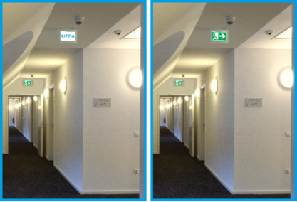 L'esempio di progetto riguarda un hotel. Normalmente vengono segnalate solo le vie di fuga e di soccorso in direzione delle due scale necessarie. Gli apparecchi TFT sono utilizzati per la segnalazione dei due ascensori. Sono posizionati alle porte tagliafuoco dei corridoi e agli ingressi degli ascensori, in modo che gli ospiti dell'hotel possano vedere la segnaletica da qualsiasi punto del piano.