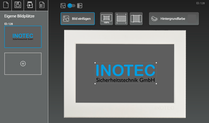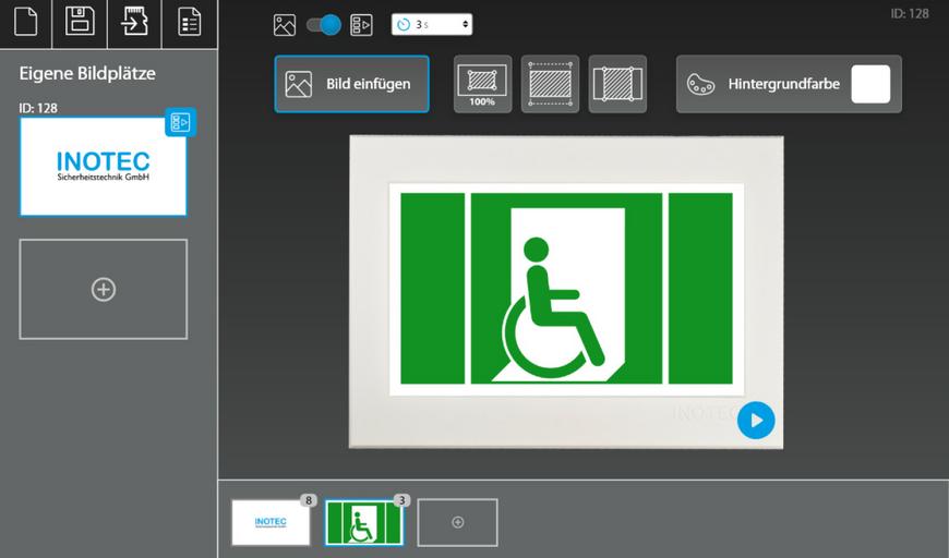 Se si desidera riprodurre i propri contenuti sull'FL 2820 TFT, è possibile configurarli utilizzando il software INOTEC PICTO+ e assegnarli a una delle 128 posizioni di memoria immagine possibili. È possibile memorizzare una singola immagine o una sequenza di immagini composta da un massimo di otto immagini in una posizione di memoria immagine. In questo modo è possibile, ad esempio, realizzare sequenze di pittogrammi composte da diversi segnali di fuga (utente in sedia a rotelle a sinistra / uscita di emergenza a destra).