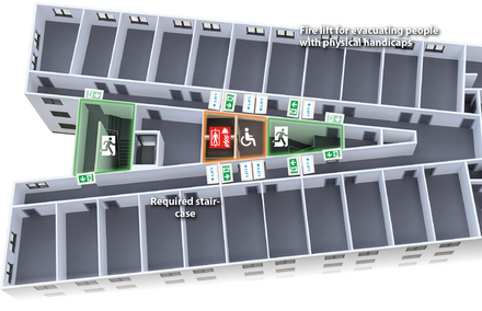 Le vie di fuga in questo edificio non sono le stesse per le persone con disabilità fisiche e per quelle senza disabilità. È quindi particolarmente importante segnalare chiaramente le vie di fuga per entrambi i gruppi di utenti. In caso di evacuazione a causa di un incendio, la segnaletica degli ascensori viene sostituita dall'indicazione di una via di fuga per le persone con disabilità fisica. Nel nostro esempio, questo soddisfa due requisiti contemporaneamente. Uno è l'etichettatura chiara della via di fuga e di salvataggio per le persone con disabilità fisiche. Il secondo è che l'omissione della segnaletica dell'ascensore impedisce alle persone senza disabilità di essere indirizzate verso gli ascensori.
