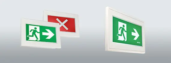 Per consentire a queste persone di lasciare gli edifici in sicurezza, è importante segnalare in modo specifico le vie di fuga e di soccorso prive di barriere, nonché i percorsi verso strutture speciali, come punti di raccolta o ascensori di evacuazione. In caso di interruzione dell'alimentazione generale, oltre alla visualizzazione liberamente selezionabile e conforme agli standard dei segnali di fuga richiesti, è possibile utilizzare anche una funzione lampeggiante per richiamare l'attenzione sulla segnaletica.