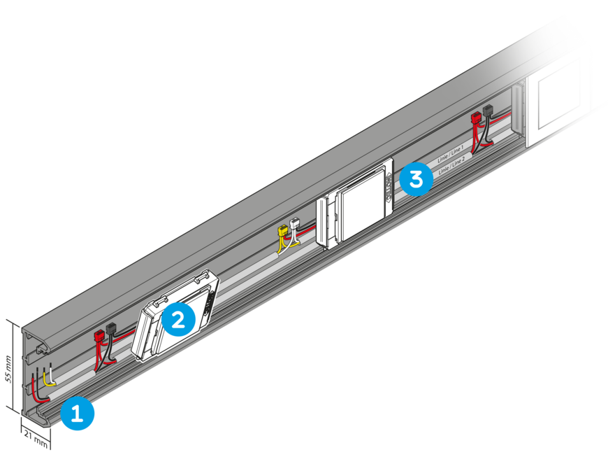 Il sistema a guida di sicurezza è costituito da un profilo in alluminio di alta qualità. Viene utilizzato per contenere i moduli GMS e per il cablaggio. Oltre alle sezioni di profilo lunghe 2 m, sono disponibili angoli interni, esterni e tappi terminali per un‘installazione facile e veloce.