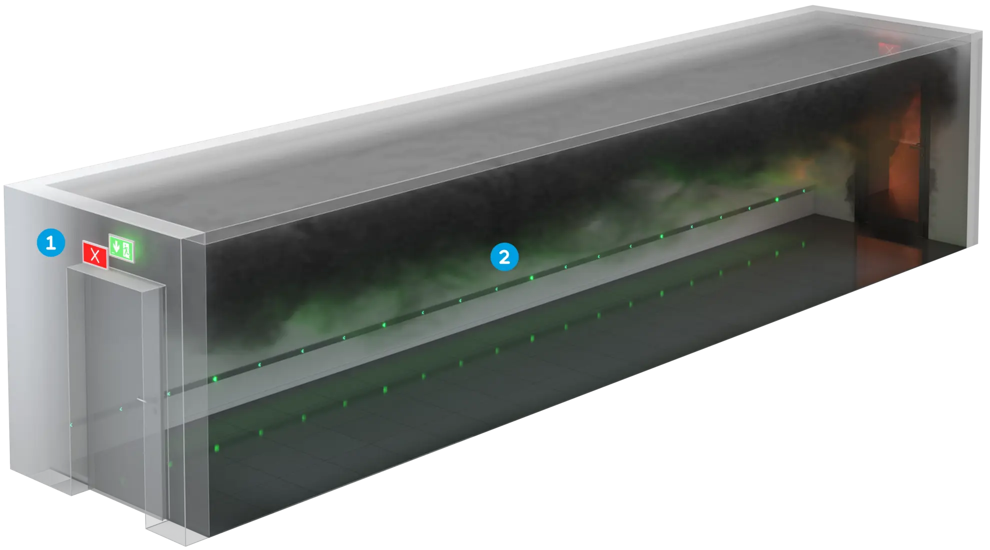 La combinazione di apparecchi dinamici per uscite di emergenza montati in alto e di un sistema a guida montato in basso garantisce una funzione di guida continua per le persone all‘interno e all‘esterno di un edificio pieno di fumo.