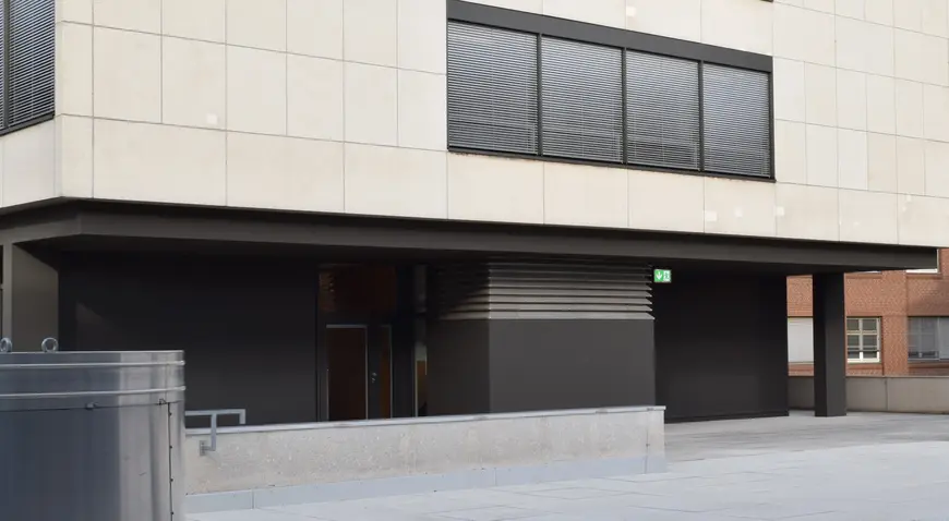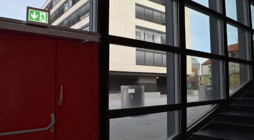Entrambe le aule sono evacuate attraverso il foyer. La segnaletica delle vie di fuga indica "libero" in tutte le aree, vale a dire che, a seconda della posizione, gli evacuati vengono guidati all'esterno attraverso l'atrio o la tromba delle scale e la rampa. Allo stesso tempo, viene attivato un allarme vocale standard che invita le persone a lasciare l'edificio per la via più breve.