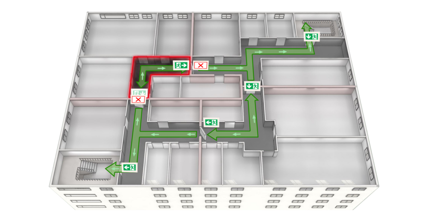 In entrambi i casi, il sistema di guida dinamica delle vie di fuga indica la via di fuga da utilizzare nella particolare situazione di pericolo. Anche se il foyer è bloccato, gli evacuati possono raggiungere l'esterno rapidamente e senza ritardi. Gli apparecchi di segnalazione delle vie di fuga sono posizionati in conformità alla norma DIN EN 1838 [2] in corrispondenza di ogni porta di uscita da utilizzare in caso di emergenza, di ogni cambio di direzione e di ogni intersezione di corridoi o disimpegni. L'apparecchio FL 2820 TFT di INOTEC viene utilizzato per la segnalazione dinamica delle vie di fuga. L'attivazione avviene tramite un solo contatto a potenziale zero del BMA: un comando molto semplice con un grande guadagno in termini di sicurezza. Per una differenziazione sicura, nel foyer è stata implementata una dipendenza da due rilevatori, ovvero la guida alle vie di fuga alternative viene attivata solo quando due rilevatori rilevano del fumo.