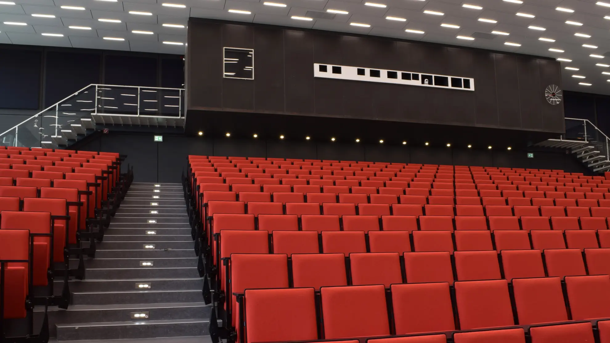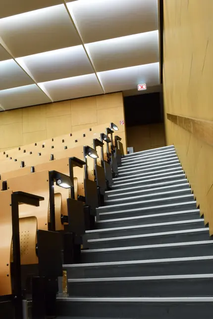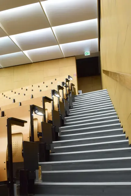 - L'illuminazione di sicurezza dell'Audimax doveva essere radicalmente modernizzata a causa della sua età avanzata. Poiché gli apparecchi di sicurezza sono solitamente ben visibili, è stato necessario trovare soluzioni speciali: da un lato è stato necessario preservare l'aspetto esistente, dall'altro è stato necessario rispettare le normative vigenti. Nell'Audimax sono state implementate diverse misure.