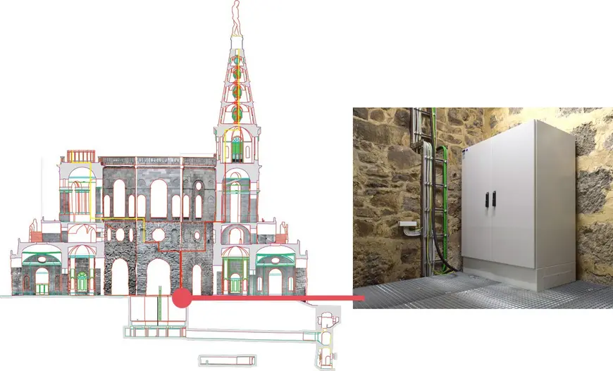 Per il sistema di alimentazione centrale, che alimenta gli apparecchi standard modificati del monumento e gli apparecchi per le uscite di emergenza in caso di interruzione della corrente, è stato costruito un armadio speciale che poteva essere diviso in due parti e trasportato attraverso la stretta porta della stanza. All'interno dell'armadio in acciaio inox IP54, un sistema di riscaldamento controllato da un umidostato assicura che le condizioni climatiche avverse della stanza fredda e umida, con alti livelli di umidità, non influiscano sul sistema di alimentazione centrale. Ciò significa che tutti i componenti elettronici e le batterie possono essere utilizzati in modo sicuro in qualsiasi momento. Le sottounità del vasto edificio garantiscono l'economicità dell'installazione.