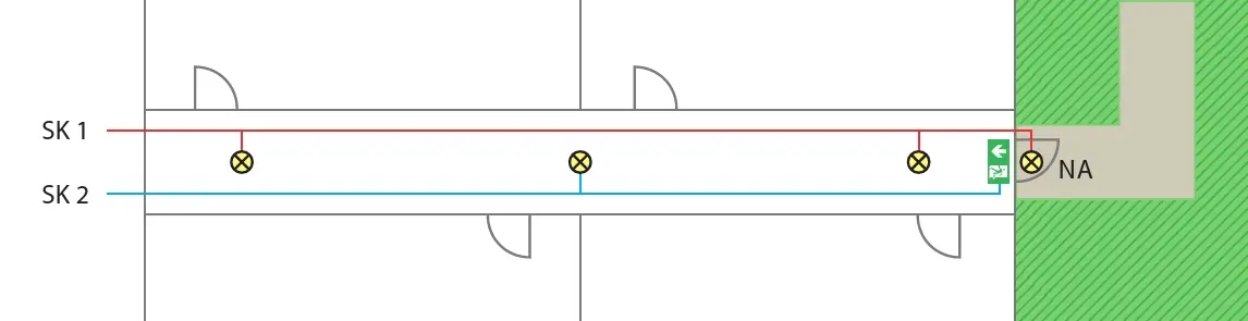 Gli apparecchi montati direttamente sulla parete esterna di un edificio per illuminare un'uscita di sicurezza dall'esterno sono facilmente collegabili a un circuito di illuminazione di emergenza nelle vicinanze. Occorre tuttavia fare attenzione a garantire un cablaggio alternato tra l'ultimo apparecchio interno e l'apparecchio esterno (Fig. 1). Se invece l'illuminazione esterna deve essere installata in posizione libera o lungo i percorsi che portano all'area di sicurezza, deve essere integrata nel concetto di sovratensione. In questo caso, ad esempio, i circuiti di illuminazione di emergenza possono essere dotati di fusibili appropriati proprio all'ingresso dell'edificio o nell'apparecchiatura di illuminazione di emergenza (Fig. 2). In fase di progettazione, consigliamo quindi di separare i circuiti per l'illuminazione di emergenza dagli apparecchi per esterni (illuminazione esterna).