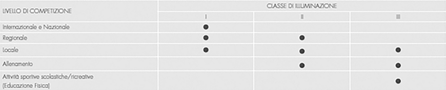 SPORT | LIVELLO (%) DI ILLUMINAZIONE DI SICUREZZA DA GARANTIRE IN CASO DI UNA MANCANZA DI ILLUMINAZIONE ORDINARIA |